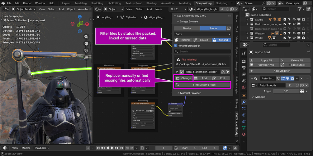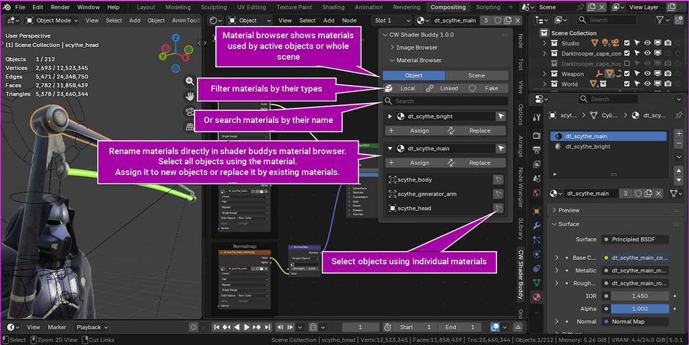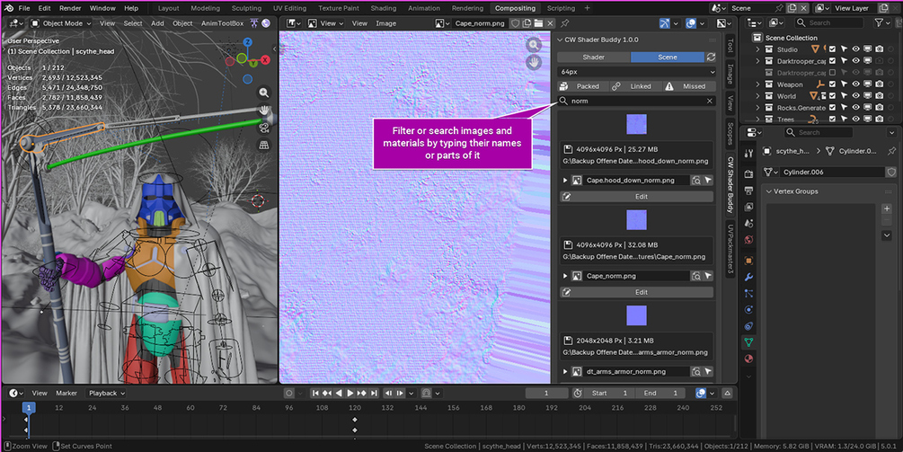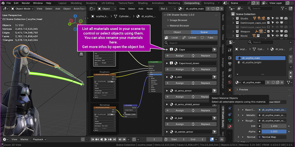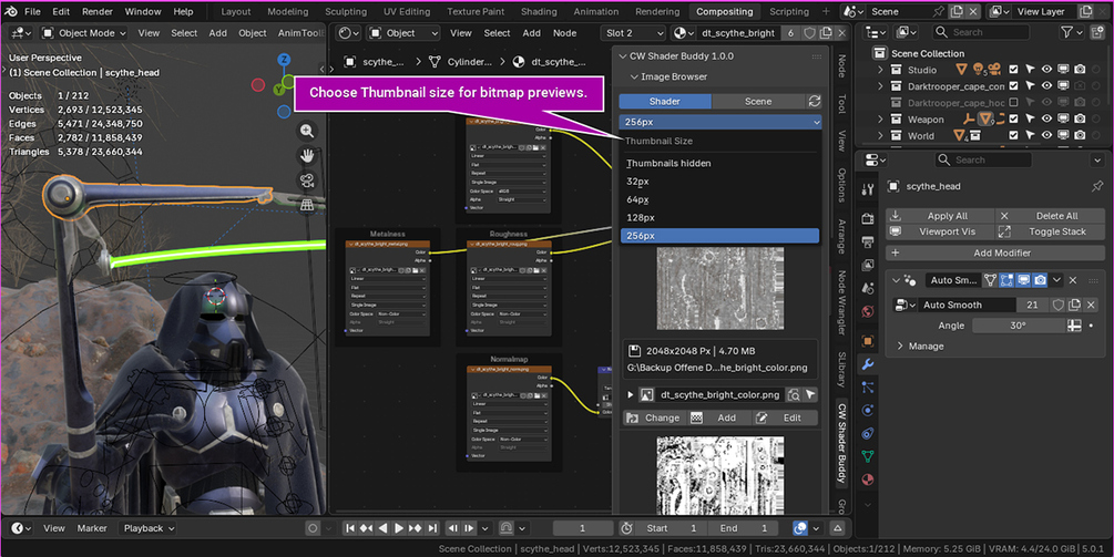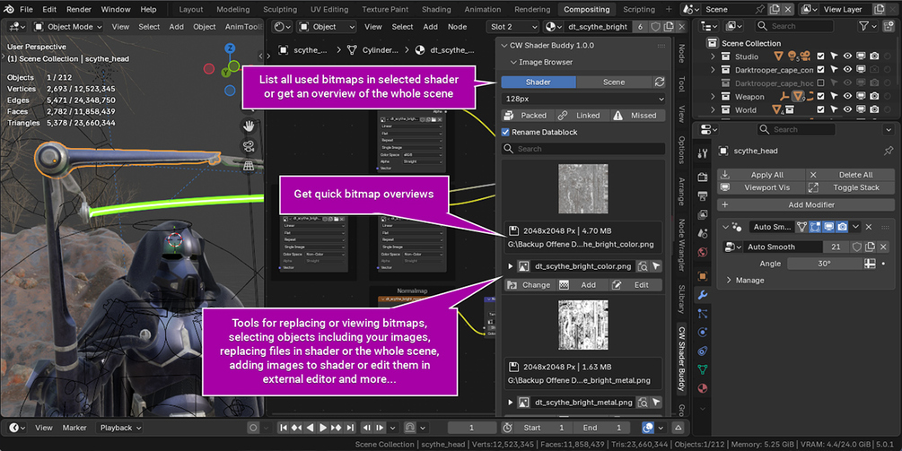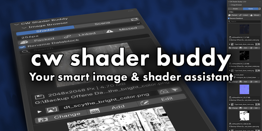 CW Shader Buddy is a Blender addon that provides tools for managing images and materials in your scenes. It adds a sidebar panel to the Shader Editor, Image Editor, and UV Editor.